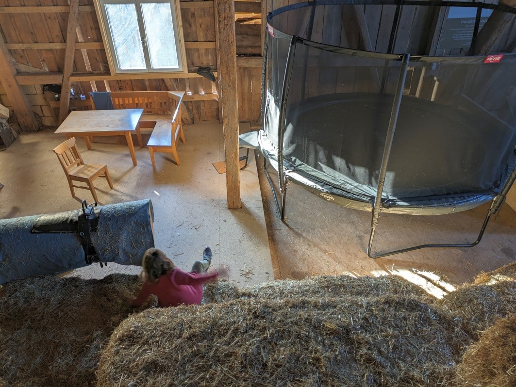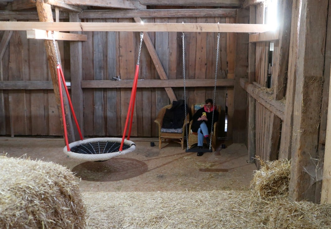 Darüber hinaus gibt es eine Waschgelegenheit, ein Gemeinschaftsraum und, der absolute Knaller: eine Spielscheune mit Tieranschluss. Dort findet sich nicht nur ein riesiger Vorrat an Stroh zum Springen, sondern auch Schaukeln, ein Trampolin und verschiedenste Spielmöglichkeiten. Unten warten im Stall die Hasen, Hühner, Ziege und Katzen auf die Feriengäste, zum Anschauen und Ausmisten : ).