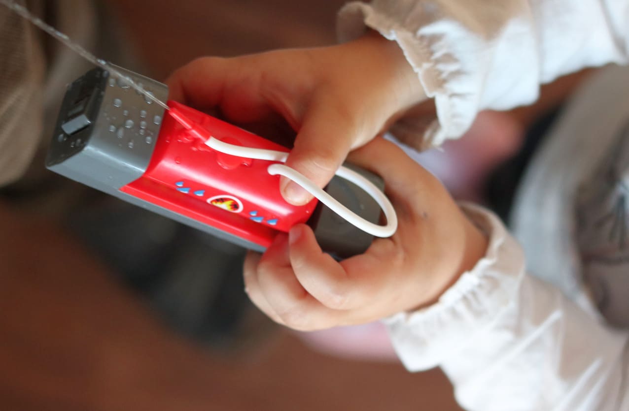 So kann der Feuerwehrzug mit drei Geschwindigkeiten vor- und rückwärts gesteuert werden, natürlich mit der passenden Geräuschkulisse. Bei höchster Stufe flitzt die Eisenbahn ordentlich. Das war genau das richtige für unsere Feuerwehrfrau, die mit dem Control Stick in der Hand sich ein Wettrennen mit der Bahn lieferte. Frei nach dem Motto wer kommt zuerst bei der Feuerwehrstation an.
