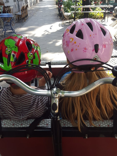 erstmal angeschnallt und behelmt im Lastenrad vorne sitzt ist er irre stolz und winkt all seinen