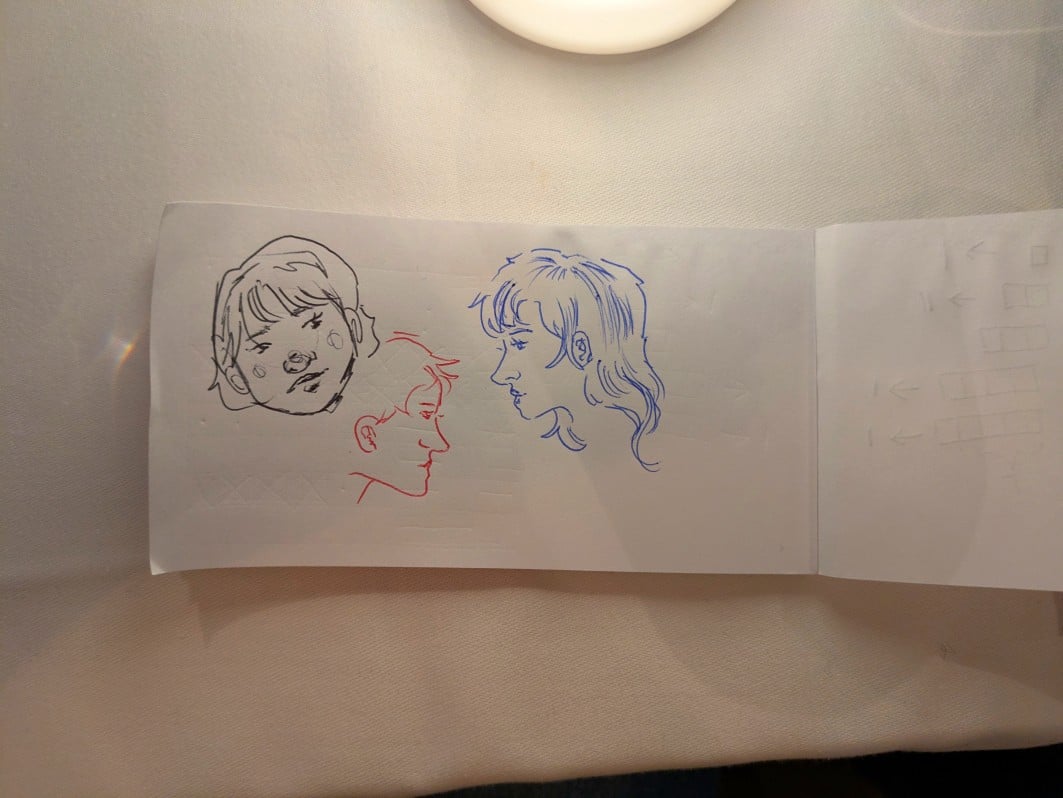 Das Kind neben mir zeichnet am Essenstisch. Ein schöner Abend vergeht so recht schnell.