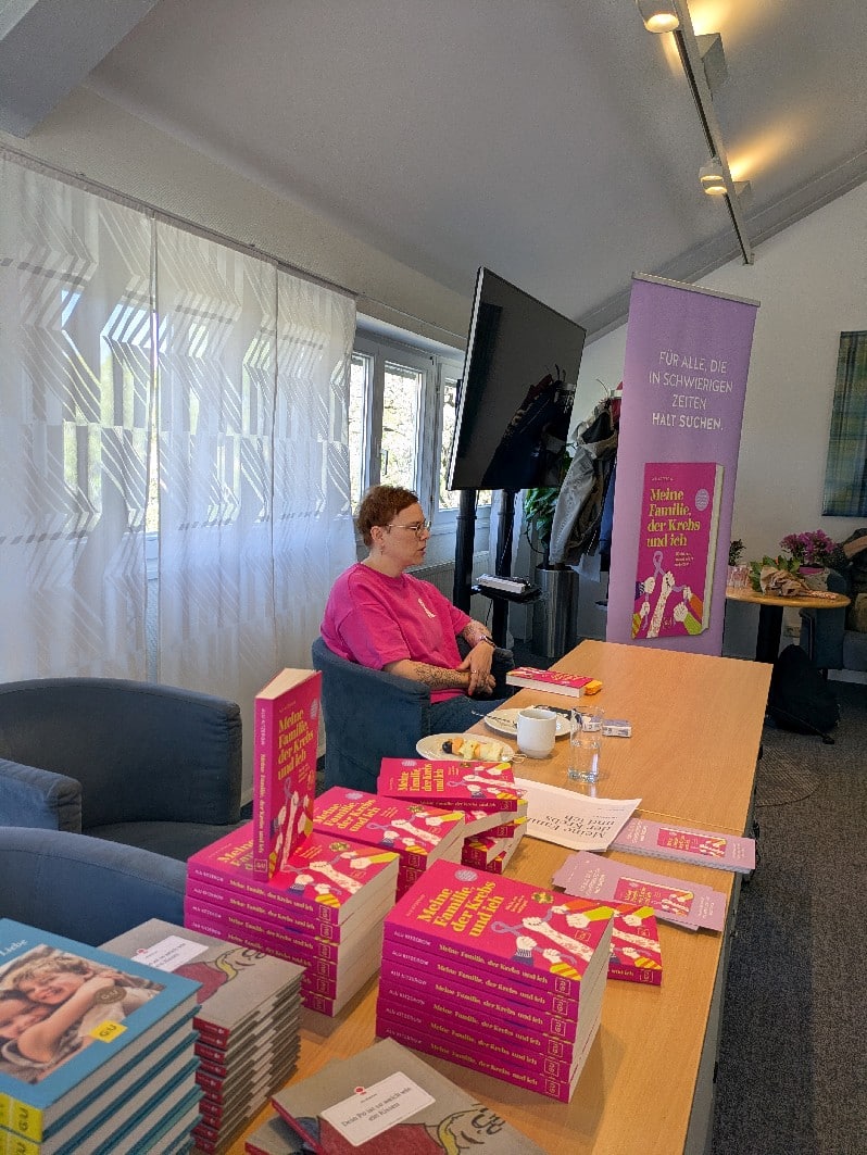 Alu stellt im kleinen Kreis ihr Buch “Meine Familie, der Krebs und ich” vor.