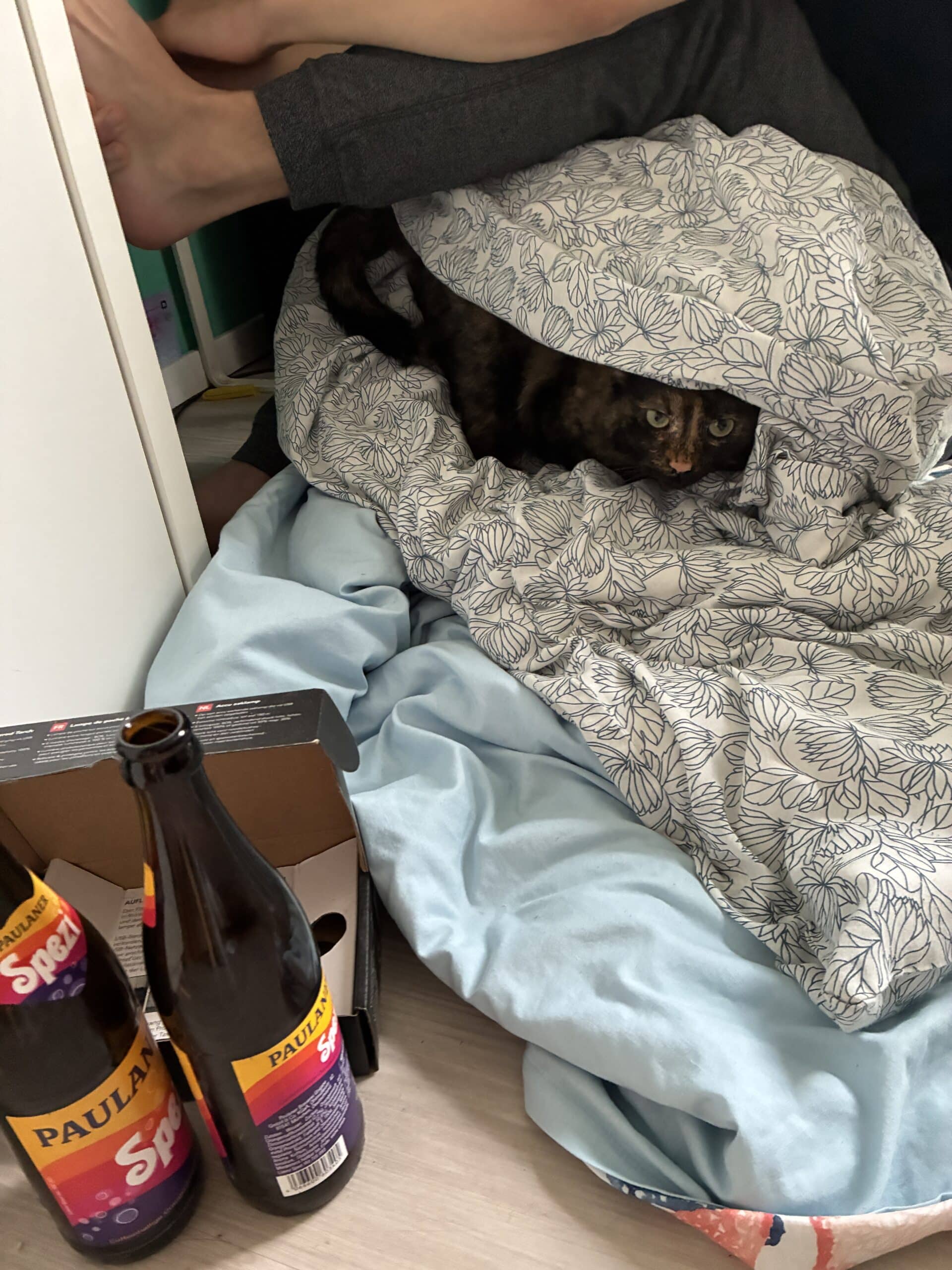 Die Katze versteckt sich im Bettzeug des Sohnes.